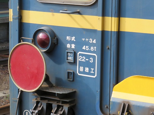 「マヤ34-2008」の文字の前にある「●」は通称「Gマーク」と言われるもので、かつて存在した信越本線 横川〜軽井沢間の急勾配「碓氷峠」を通過可能な車両についているもの。